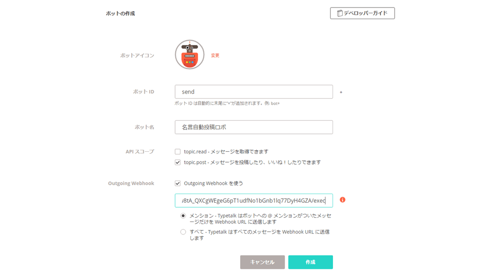 この例では、「send」としています。ボット名には、適当な名称を入力してください。ここでは、「名言自動投稿ロボ」としています。