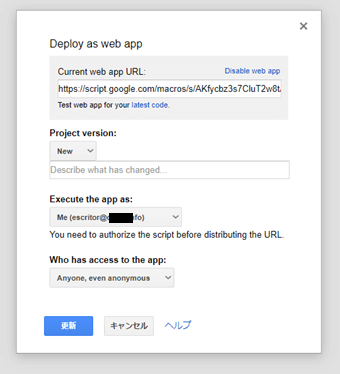 「Deploy as web app」ダイアログでProject versionを「new」に、Execute the app as:を「Me」に、Who has access to the appを「Anyone, evens anonymous」に設定します。
