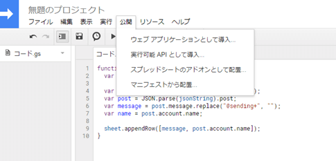 関数ができたら、Google Action Scriptの画面のメニューの「公開」から、「ウェブアプリケーションとして導入」を選択してください。