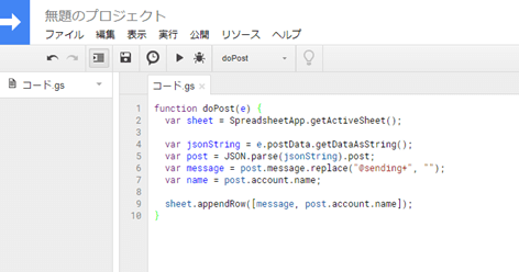 TypetalkからのWebhookは、「doPost(e)」という関数を起動させます。
