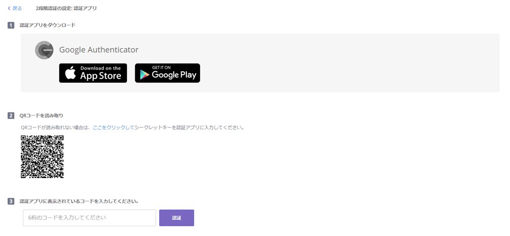 ①「アプリを利用して認証コードを取得する」は、Googleのサービス「Google Authenticator」を利用する方法
