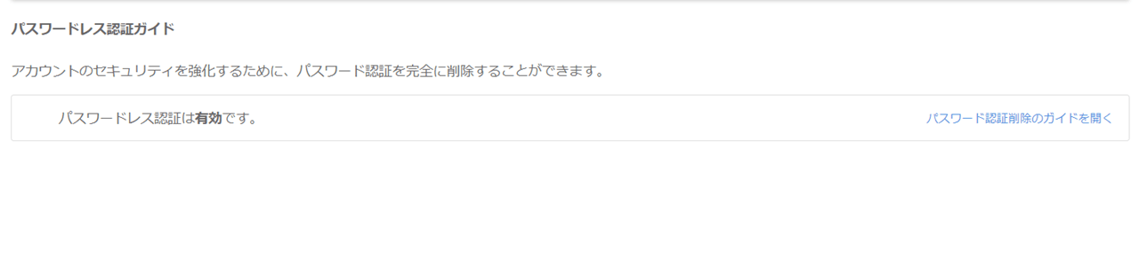 プロフィール画面の「セキュリティ」タブを選択したら、左側のナビに「パスワードレス認証ガイド」という項目が現れます。
