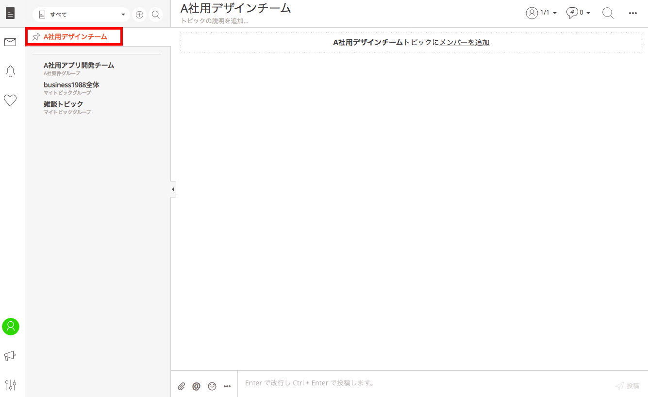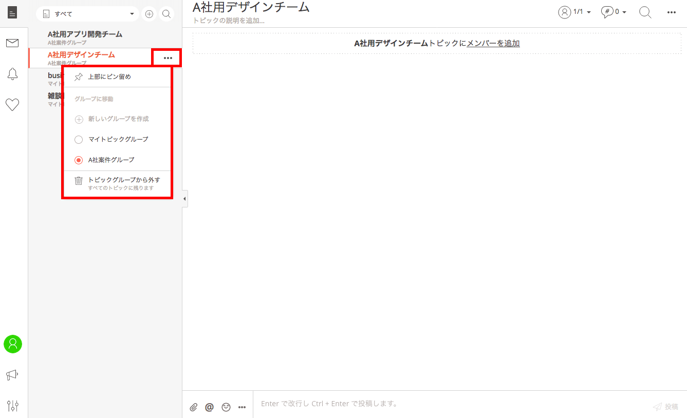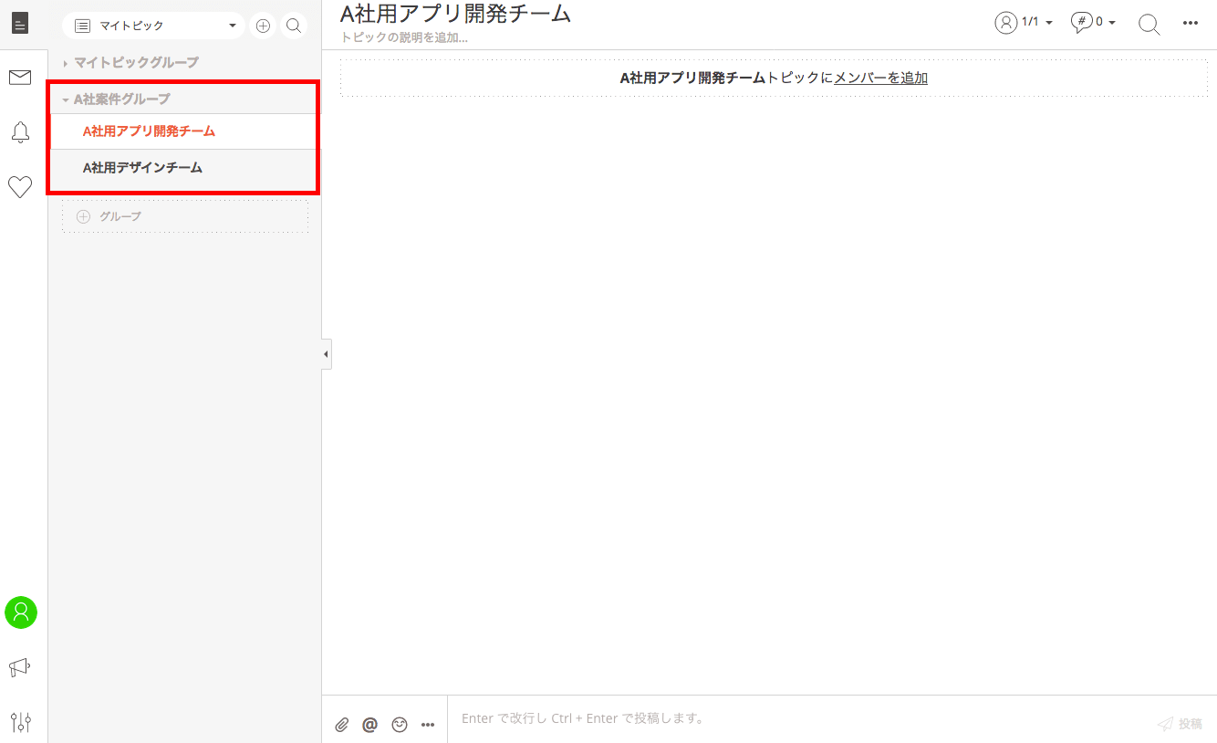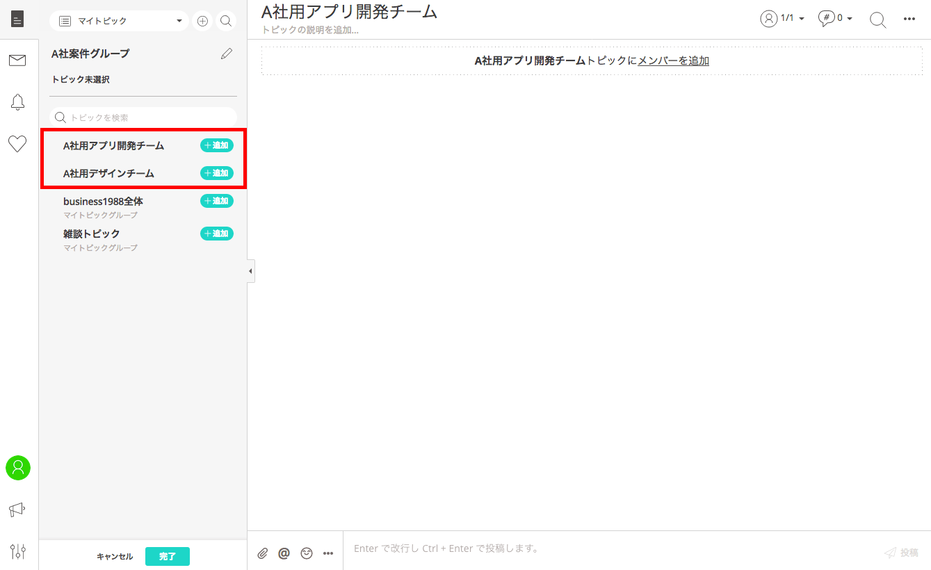 例えば、「A社用デザインチーム」と「A社用アプリ開発チーム」のトピックは、同じA社関連であっても、業務内容が異なります。