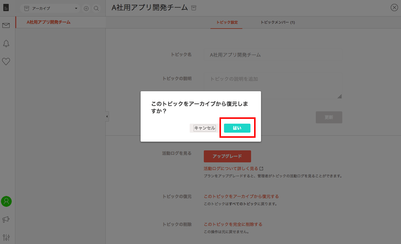 トピックをアーカイブから復元する事の確認画面が表示されるので「はい」を選択しましょう。