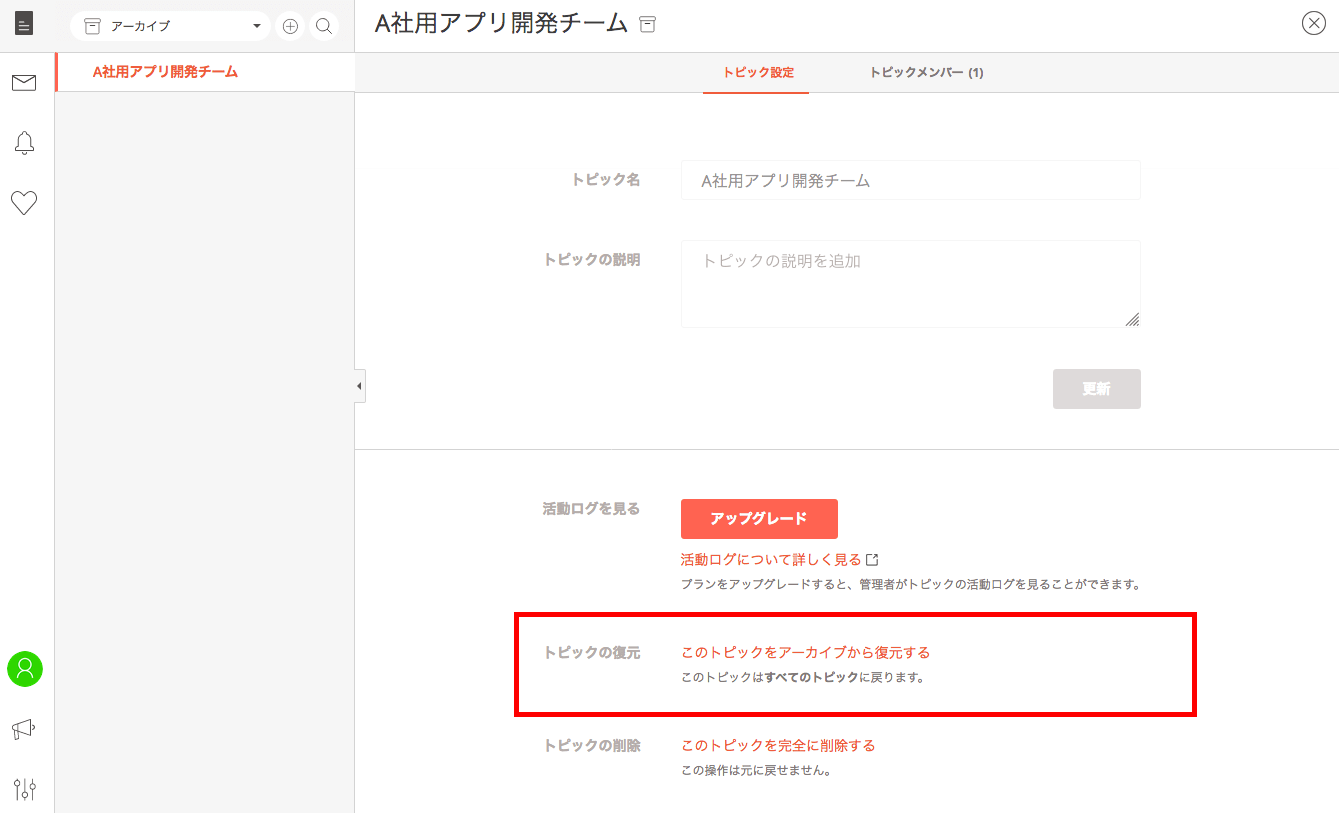 アーカイブしたトピック名を変更したい場合や、メッセージを新たに投稿したい場合などは、アーカイブからトピックを復元する必要があります。