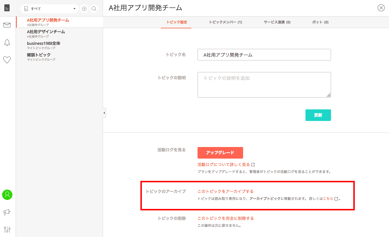 ただしトピックをアーカイブにまわすと、トピック一覧には表示されず読み取り専用となり、ボットや外部連携していたものも全て解除されてしまうので注意してください。