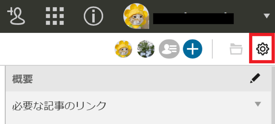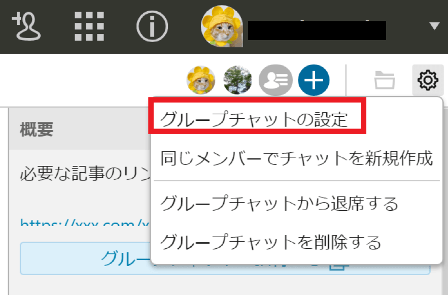 ミュートしたいグループチャットを表示して、画面左上の歯車アイコンをクリックします。