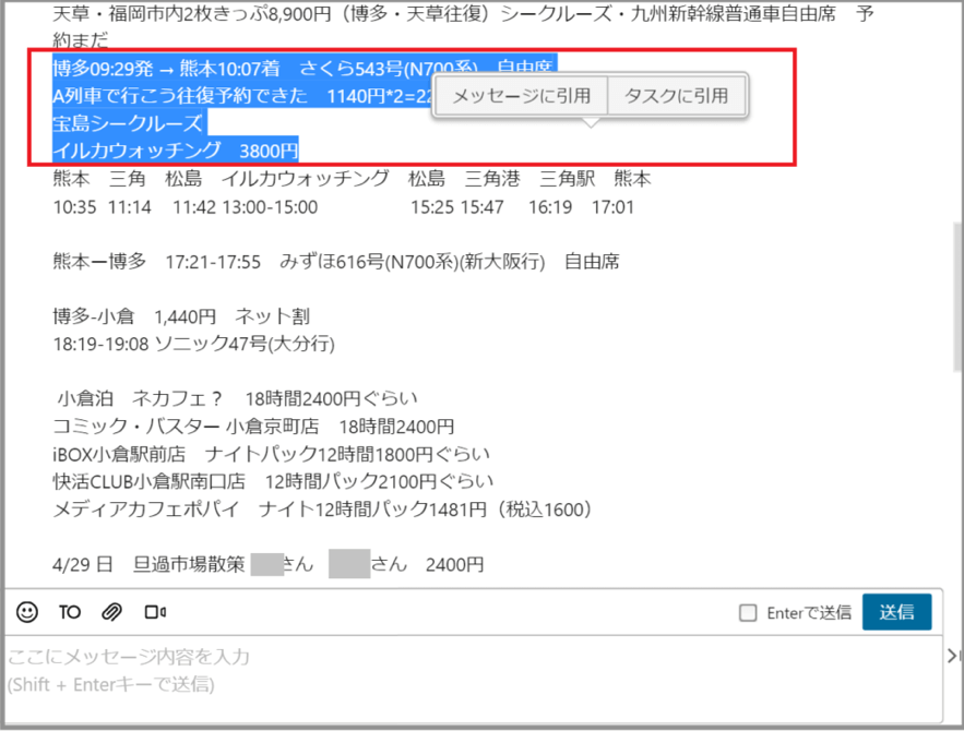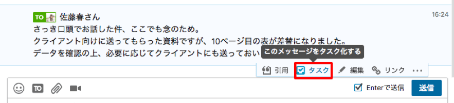 実は、このタスク画面を開かなくても、既存メッセージのやりとりをそのままタスク化するという方法があるんです。