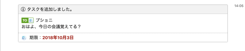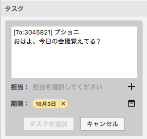 すると、このように相手にTOを付けたタスクが送信できます。ちょっとした小技ですが、相手に気づいてもらいやすいのでぜひお試しください。