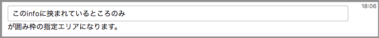 [info]このinfoに挟まれているところのみ>[/info]が囲み枠の指定エリアになります。