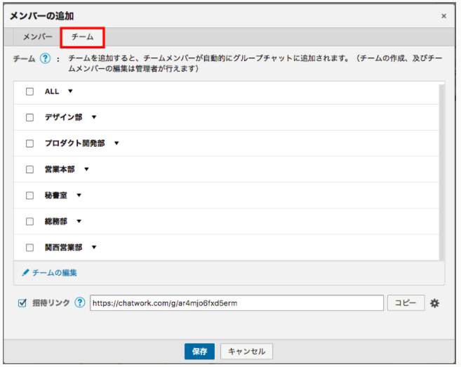 その後,チームタブを開きます。チームタブに、管理者が作成したチームの一覧が表示されますので、グループチャットに入れたいチームを選択して保存します。