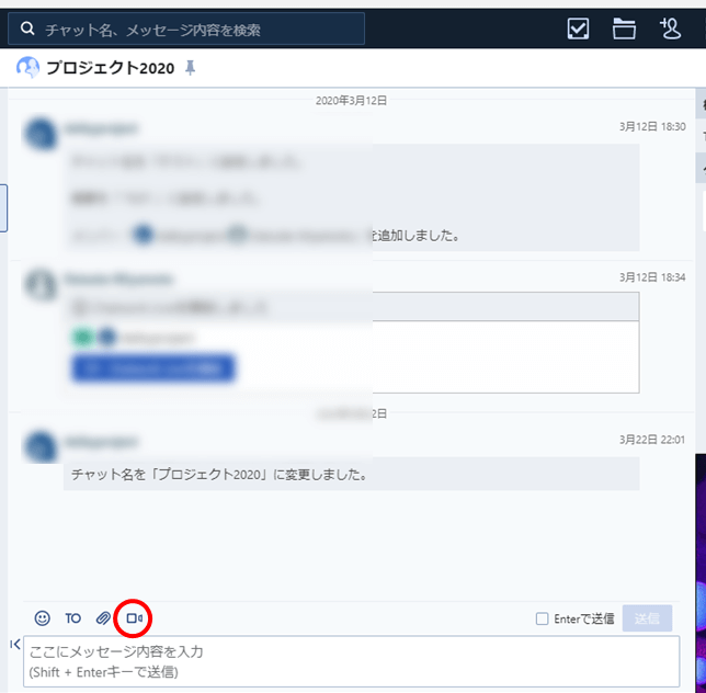 Web会議をしたいグループチャットを選択して、個人のコンタクトのときと同じように、チャット欄の下部にあるビデオカメラのアイコンをクリック。