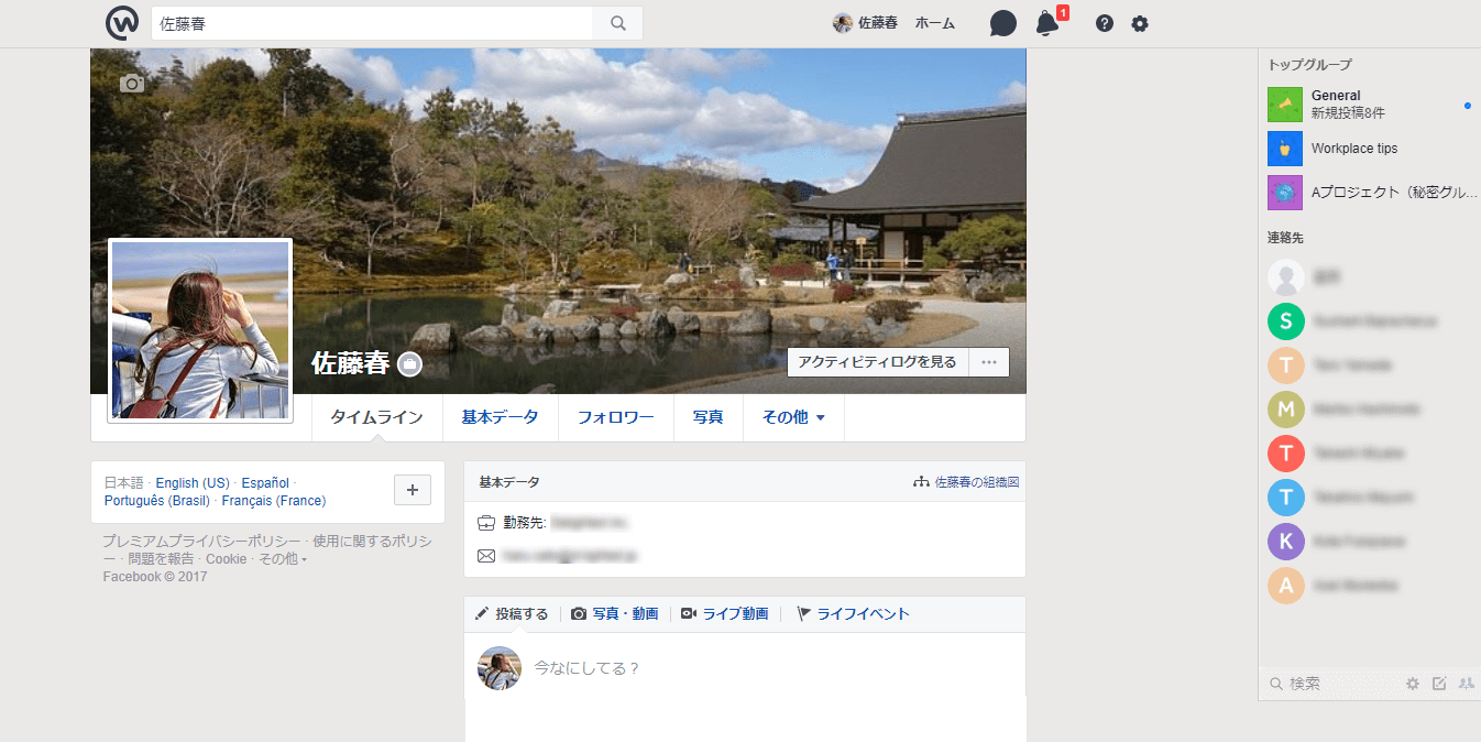 ▼Workplaceの個人プロフィール画面……フェイスブックに見えますね。。。