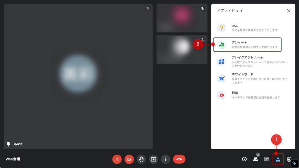 右下の「アクティビティアイコン」→「アンケート」→「アンケートを開始」