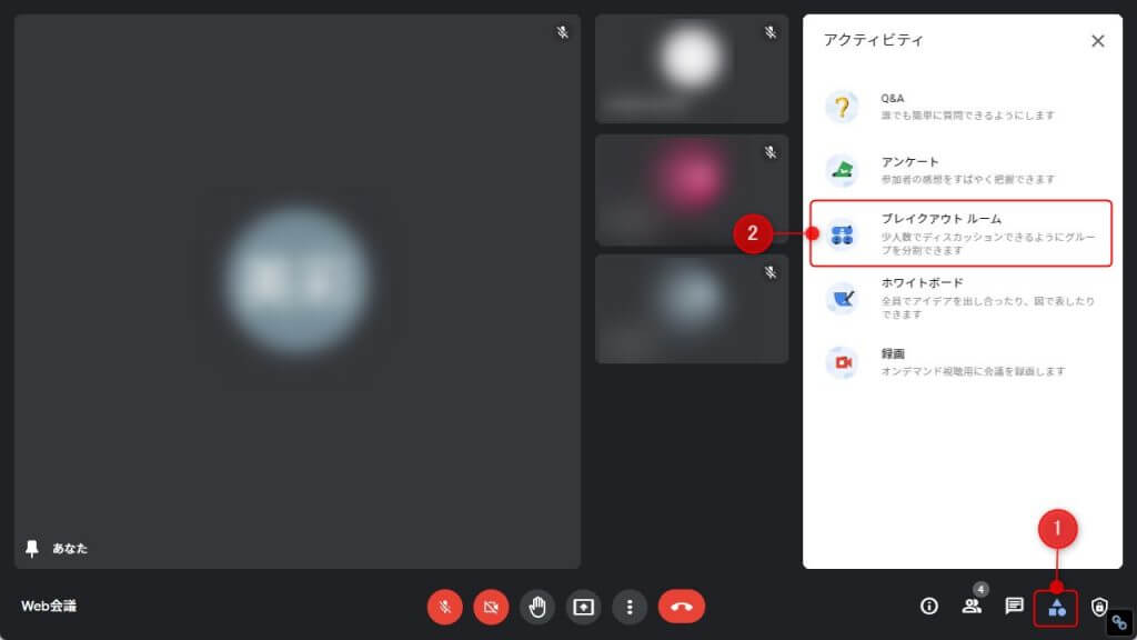 右下の「アクティビティアイコン」→「ブレイクアウトルーム」→「ブレイクアウトルーム作成」