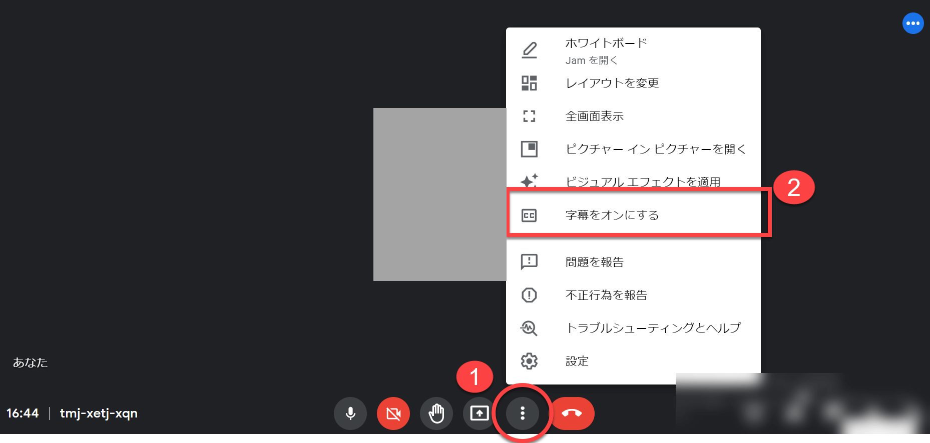 「3点リーダー」→「字幕をオンにする」→必要に応じて言語を選ぶ