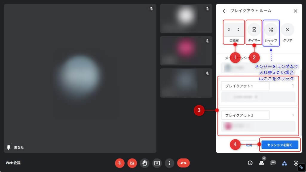 必要に応じて「ルームの数」、「タイマー」、ルームごとのメンバーを選択して「セッションを開く」を押して開始。
