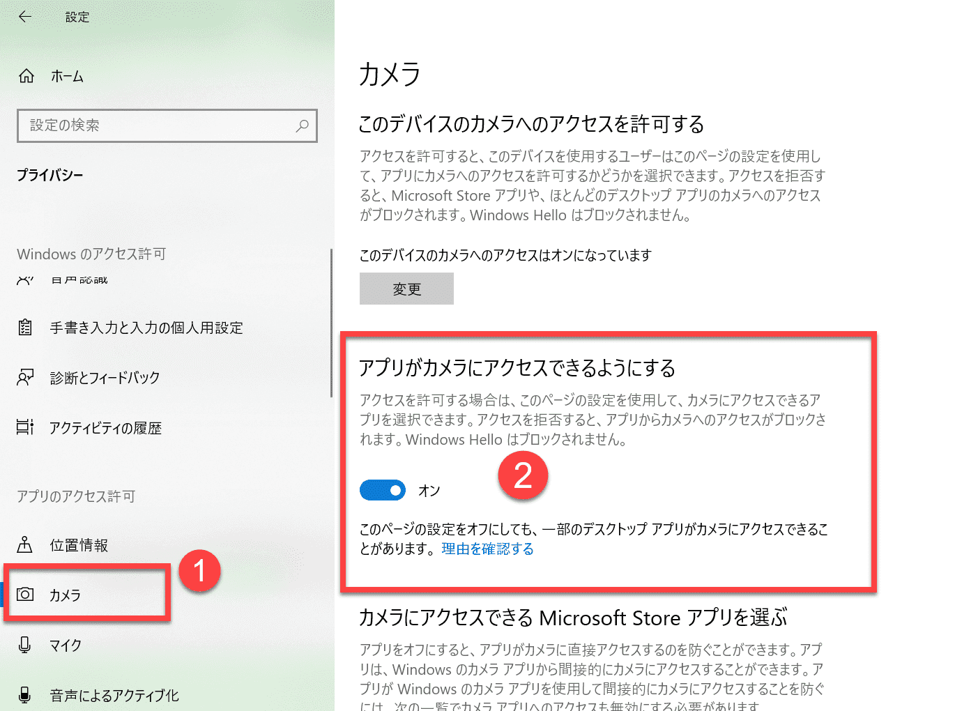 ③「カメラ」を選択し、「アプリがカメラにアクセスできるようにする」と「デスクトップアプリがカメラにアクセスできるようにする」両方を「オン」にする。