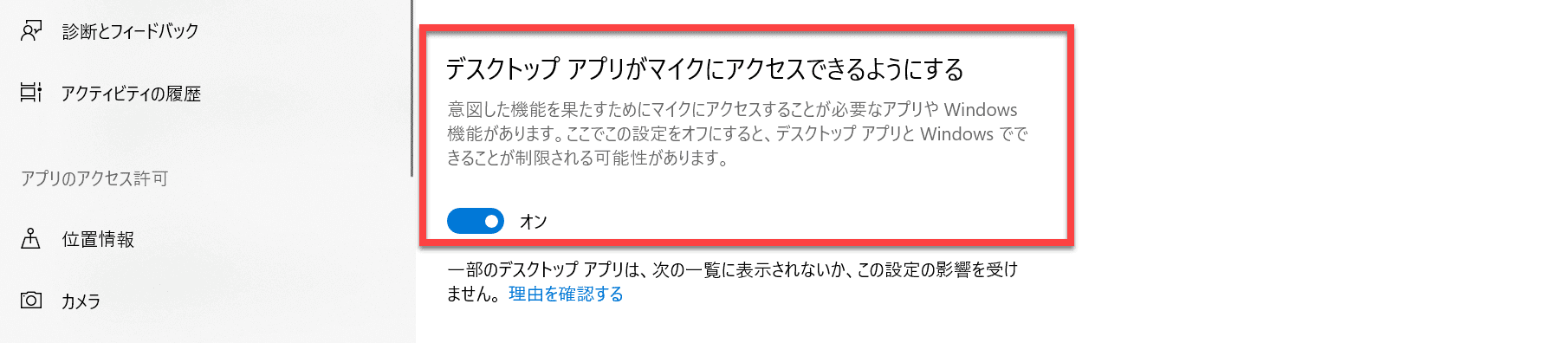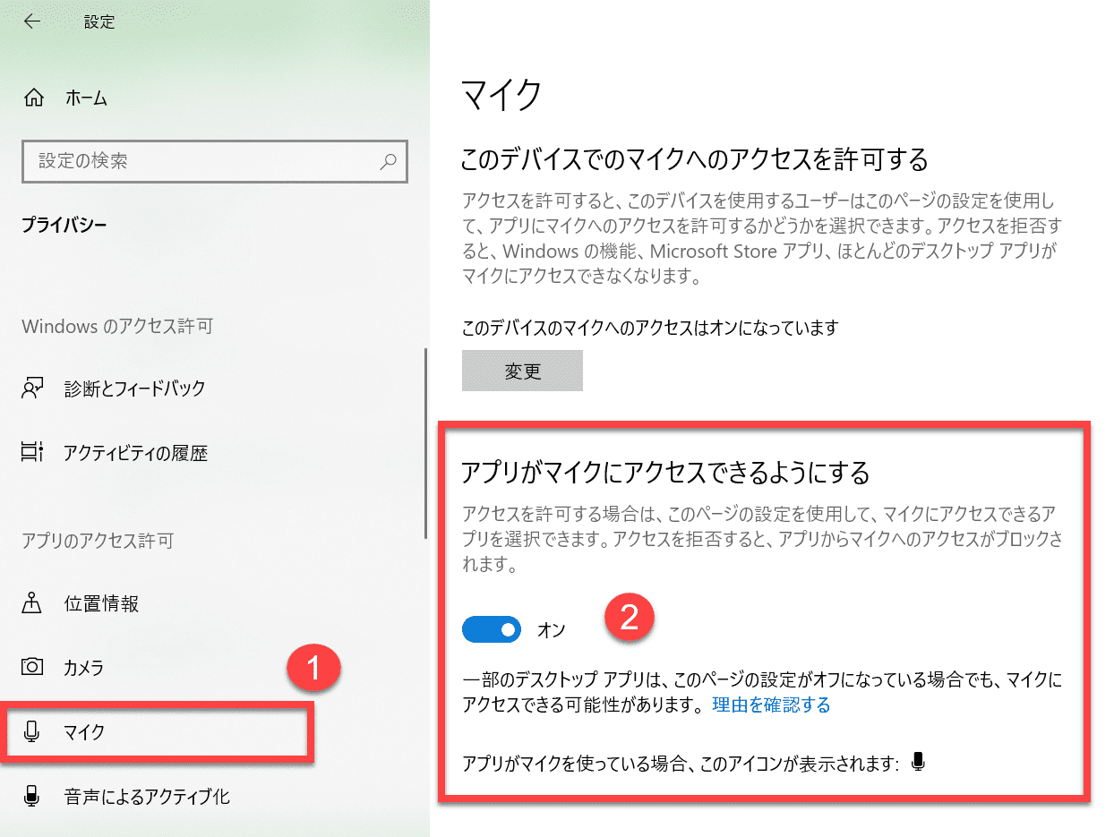 「アプリがマイクにアクセスできるようにする」と「デスクトップアプリがマイクにアクセスできるようにする」両方を「オン」にする。