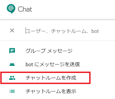 最初にログインすると、すでに自分が所属しているチャットルームが確認可能です。独自のチャットルームが必要なら、左上の「+」アイコンを押すと「チャットルームを作成」メニューが出てくるので、このメニューを選択しましょう。