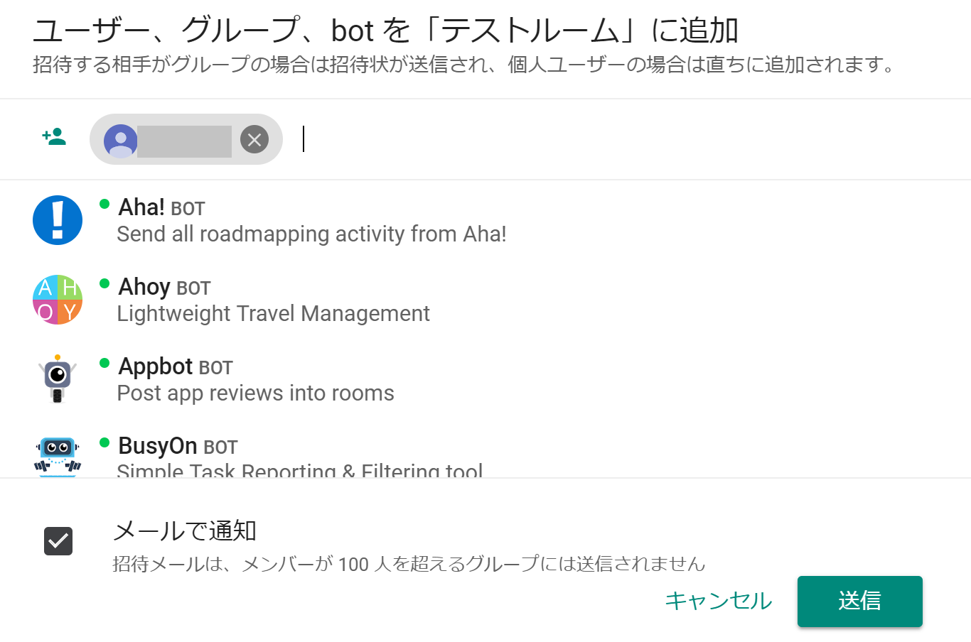 フィルタ検索を使えば一部の文字を指定するだけで名前が表示されるため、とても探しやすいです。ユーザーへの連絡はメール通知もでき、チャットルームに招待されたことが分かります。
