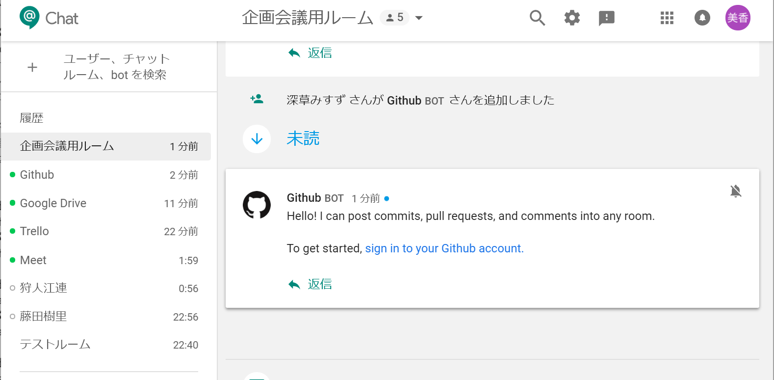 Github botは、Githubで行われているファイル操作をGoogle Chatに連携してくれます。これにより、プロジェクトのファイル更新についてモニタリングが可能です。