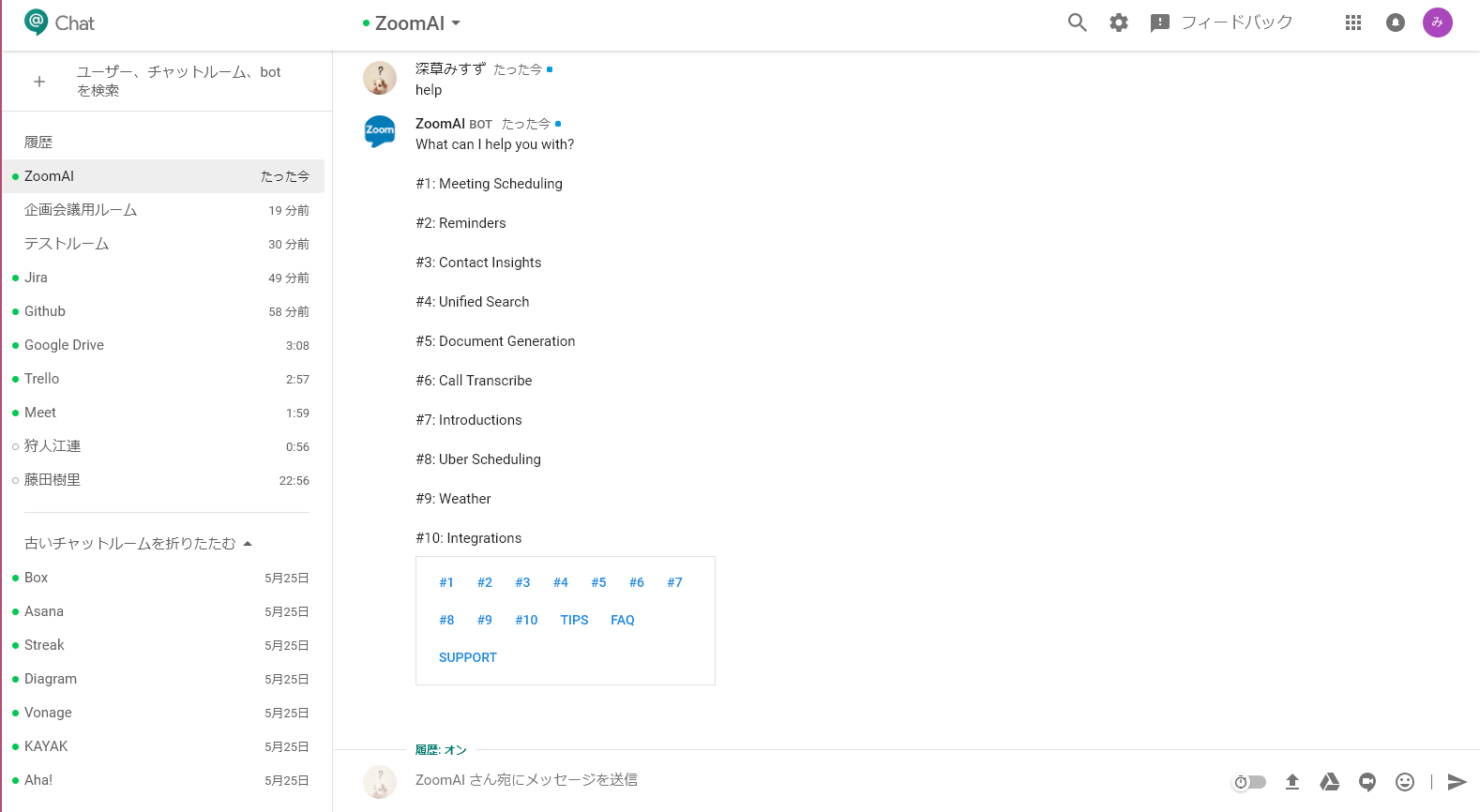 ZoomAI botは、リマインダーや天気予報など、Google Chat上で日々の仕事を助けてくれる秘書としてはたらいてくれるbotです。helpと話しかけるだけで、多くのメニューを表示してくれるなど、いつでも仕事をしてくれます。