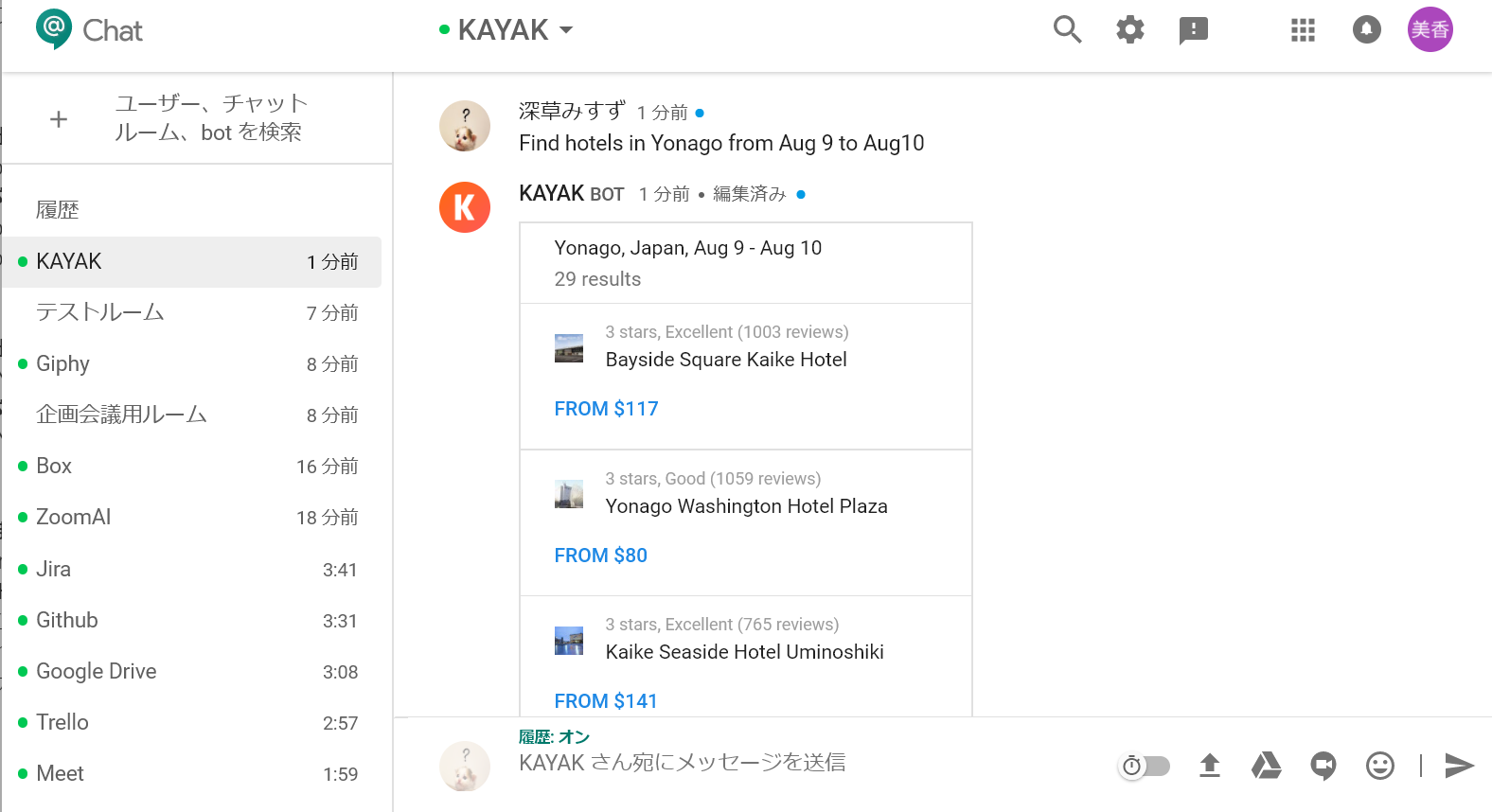 KAYAK botは、Google Chatから飛行機や宿泊施設の検索ができるbot。「Find hotels in Yonago from Aug 9 to Aug10」などと入力すればOK。各国のホテルがしっかり検索できます。急な出張でホテルをさっと探したい時などに使えそうです。