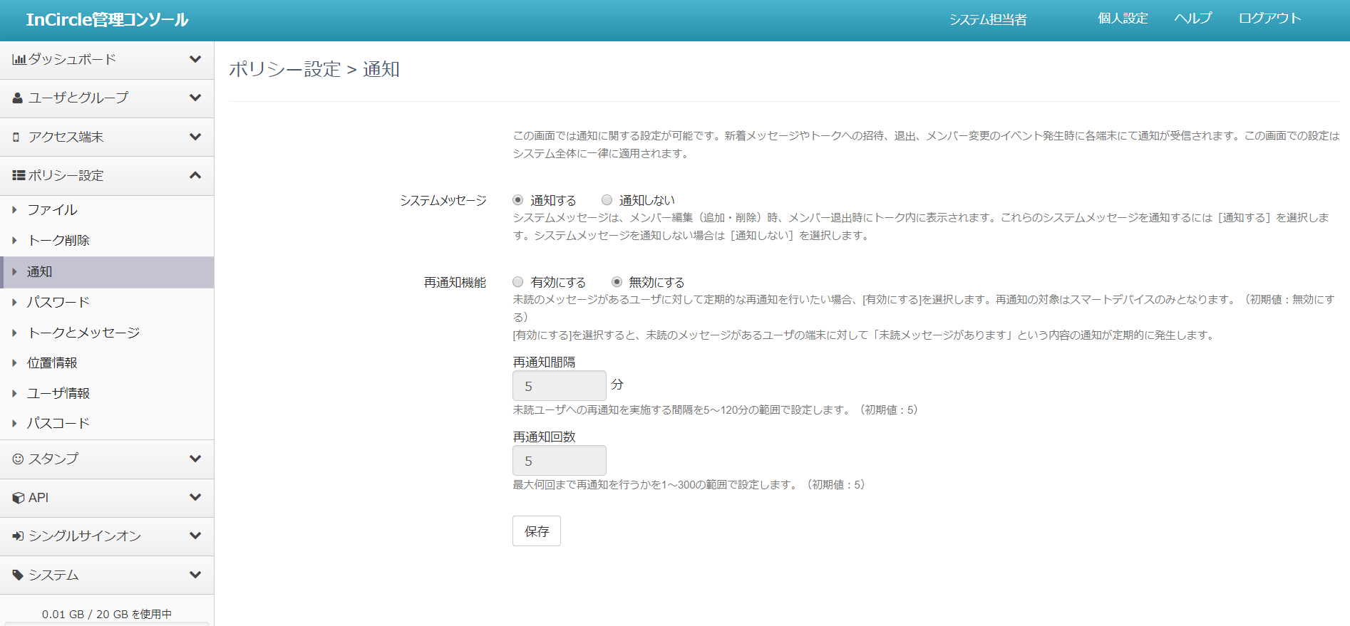 システム通知設定はシステム管理者側で制御します。システム通知をするかどうかの選択と、未読の再通知機能を有効にするかどうかの設定が可能です。
