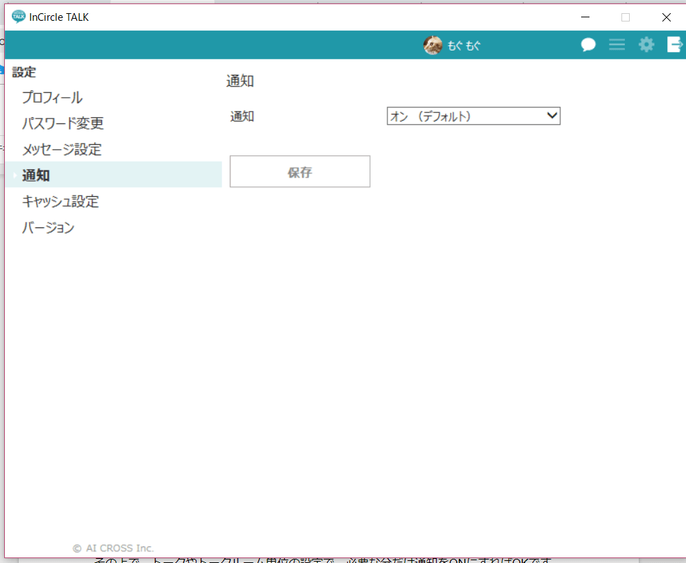 インサークルの画面右上にある歯車アイコンをクリックすると、ユーザーの設定画面がでてくるため、「通知」部分のコンボボックスで通知のオン・オフを切り替えてください。