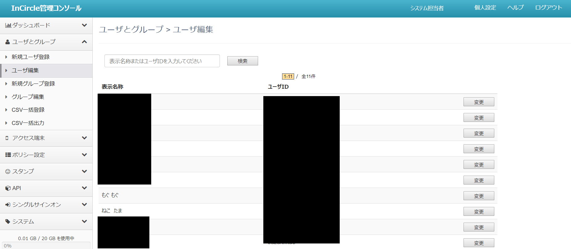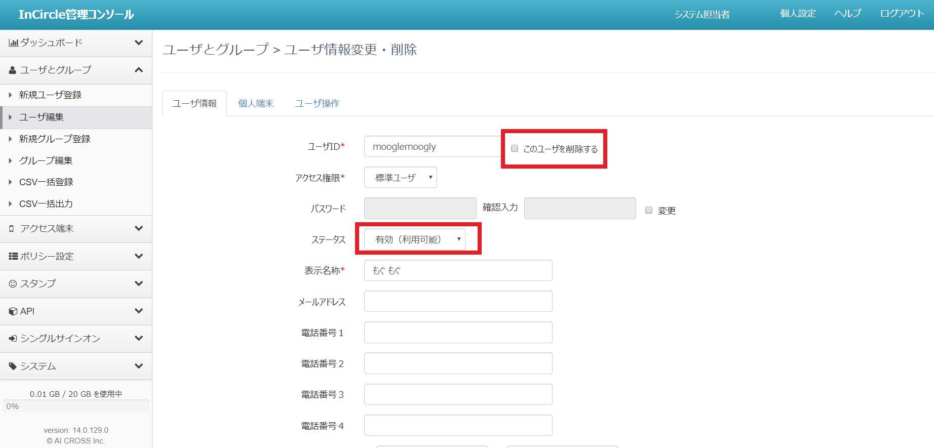 インサークルの管理コンソール内にある「ユーザとグループ」でユーザ管理が実行できます。