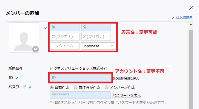 管理者アカウント、メンバーアカウントともに、一度登録したLINE WORKSのアカウント名は変更できません。