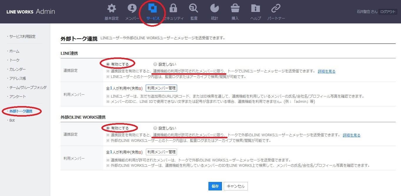 管理者アカウントでは、LINEとメンバーアカウントをつなげたり、モバイル端末で使った場合のセキュリティ付与をつけたりできます。