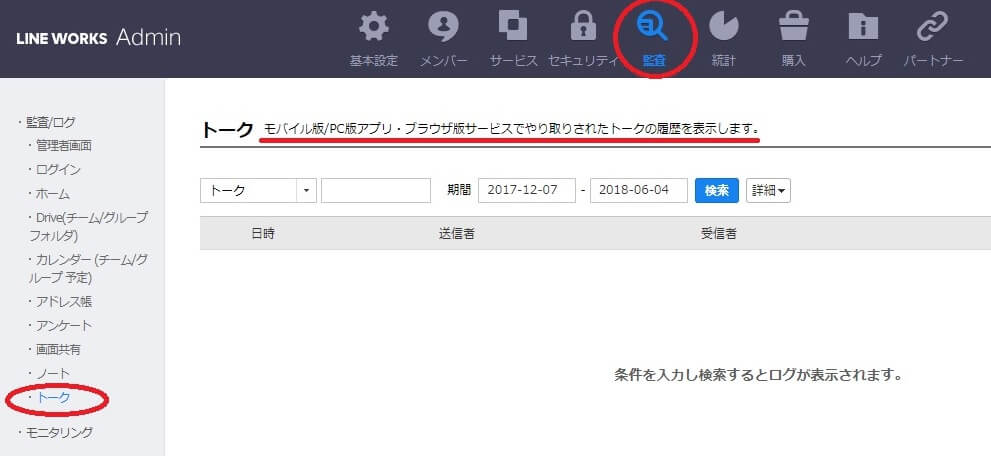 また、利用日時、作業内容、IPアドレス、メールアドレスなどの条件で、トークの履歴などアカウントの利用状況を検索、確認することができます。