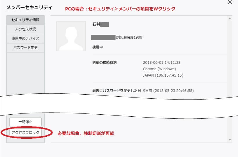 ただし、不正なアクセスを切断したとしても、キャッシュなど端末の設定により再ログインできてしまう場合があります。