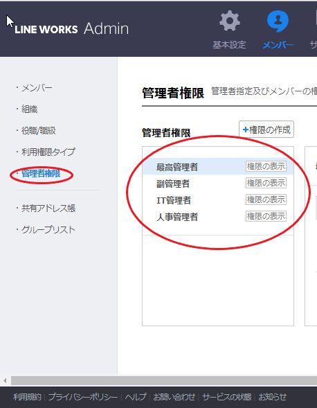 LINE WORKSでは、管理者権限としてデフォルトで以下の4つが設定されています。