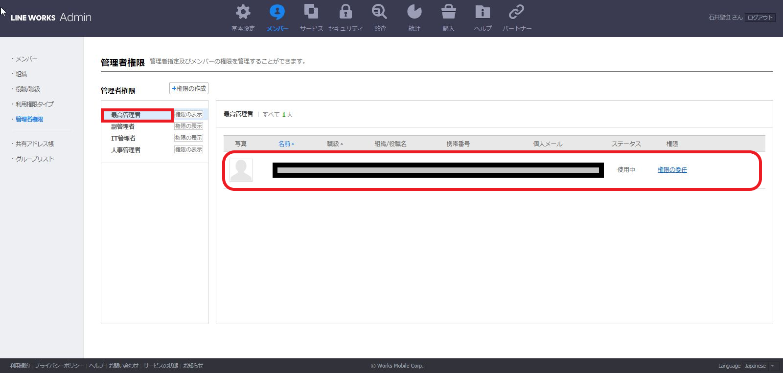上記では最高管理者1名のみですが、他の管理者権限で複数人に権限を付与していれば、そのメンバーをすべて確認することができます。