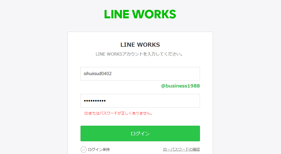 LINE WORKSでは、アカウント(ID)を上段に、パスワードを下段に入力してログインしますが、両方、もしくはどちらかに誤りがあると「IDまたはパスワードが正しくありません。」というエラーが表示されます。