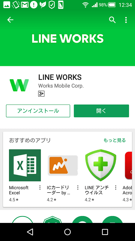 アンインストールはキャッシュクリアと同じ画面で実行できます。もちろんアプリをアンインストールしても、IDとパスワードを入力して再ログインすれば今まで通りに使用を継続できます。LINE WORKSの中で使用していたデータが消えてしまうことはありませんので、ご安心ください。
