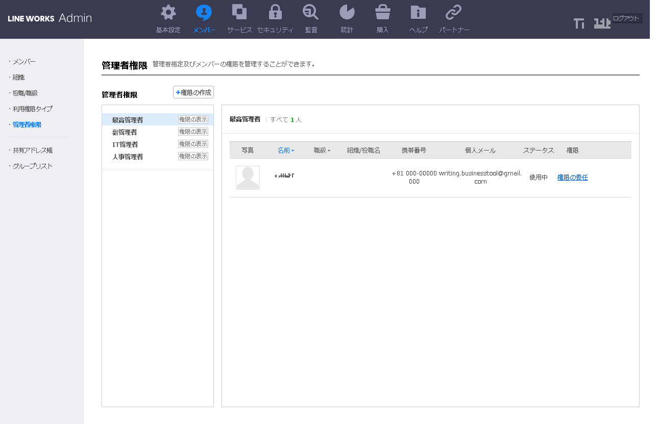 LINE WORKSでは管理者権限がデフォルトで設定されています。最高管理者、副管理者、IT管理者、人事管理者の4つです。