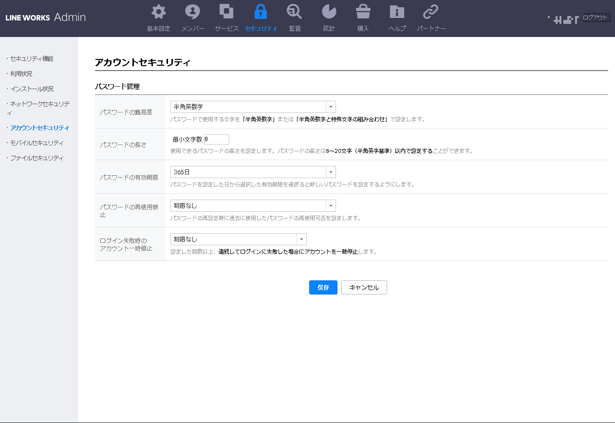 LINE WORKSを安心して使うために、管理者はパスワードポリシーの設定をする必要があります。簡単なパスワードの使用制限、パスワードの変更を促す、パスワードを強制的に変更することができ、十全なセキュリティを確保することが可能です。
