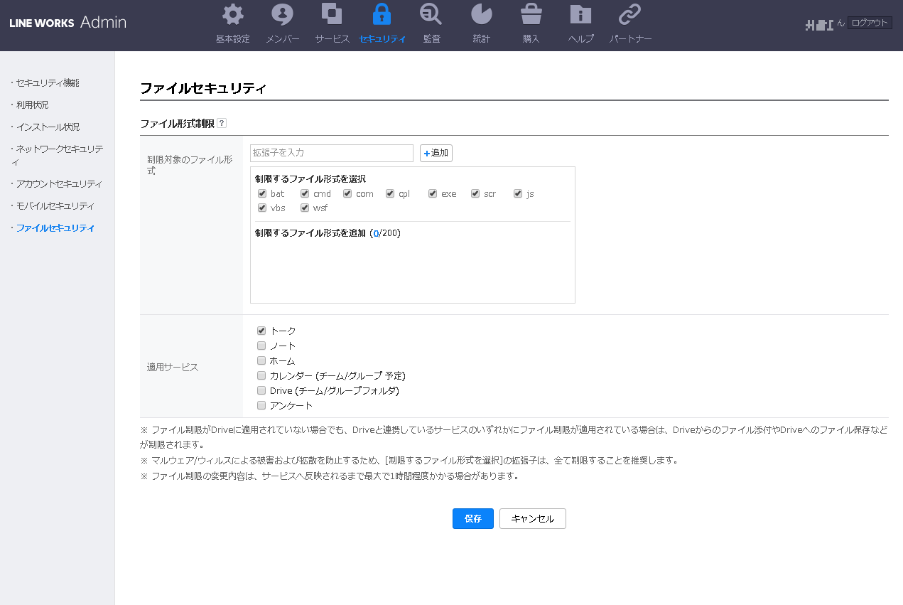 このようなリスクを軽減するために、管理者はファイル形式を指定してファイルの共有を制限することが可能です。