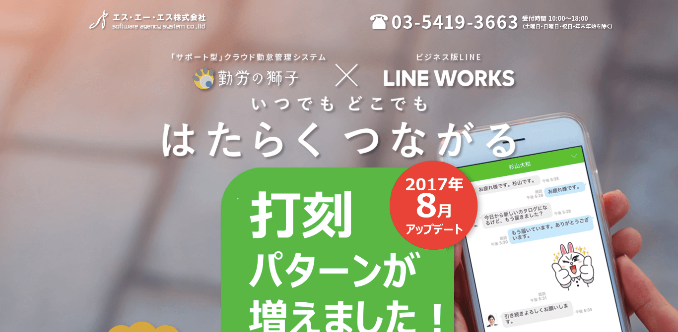 「勤労の獅子-LINEWORKS 勤怠連携オプション」は、出張先や打ち合わせ先などへ直行しなくてはならないときや、営業先から直帰したいときなどでも、スマホやタブレットから簡単に打刻ができるシステムです。
