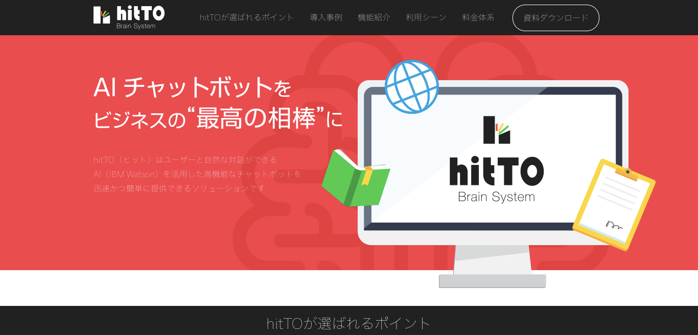 「hitTO」は、AIによるチャットボットサービスです。ユーザーからのさまざまな問いかけに対して、自然な対話形式で的確な内容を答えてくれます。