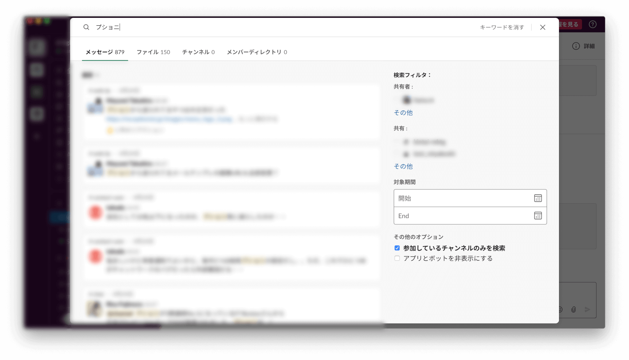 Slackでは、検索をすると関連するメンバーやメッセージ、ファイル、チャンネルをみつけることができます。また、検索フィルターも秀逸で、ある単語を「いつ」「どこで」「誰が」といったように、絞り込むことが可能です。