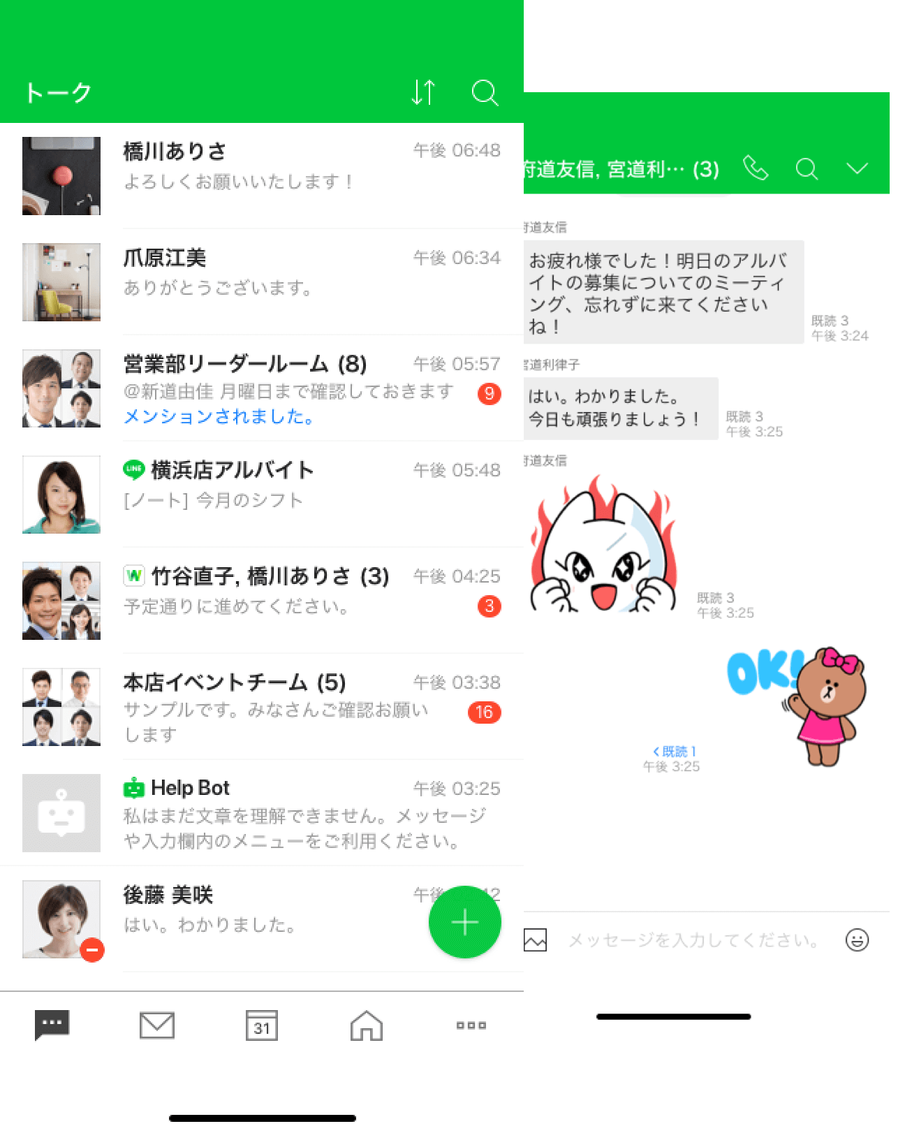 一つの画面内で、LINE WORKSユーザーとも、LINEユーザーとも会話ができています。
