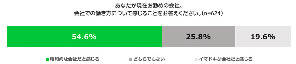 「あなたが現在お勤めの会社、会社での働き方について感じることをお答えください。」という質問では半数以上の人が「昭和的な会社だと感じる」と回答しました。