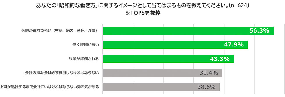 - ②昭和的な働き方イメージTOP3は、1位「休暇が取りづらい」、2位「働く時間が長い」、3位「残業が評価される」