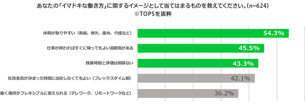 - ③イマドキな働き方のイメージTOP3は、1位「休暇が取りやすい」、2位「仕事が終わればすぐに帰っても良い雰囲気がある」、3位「残業時間と評価は関係ない」