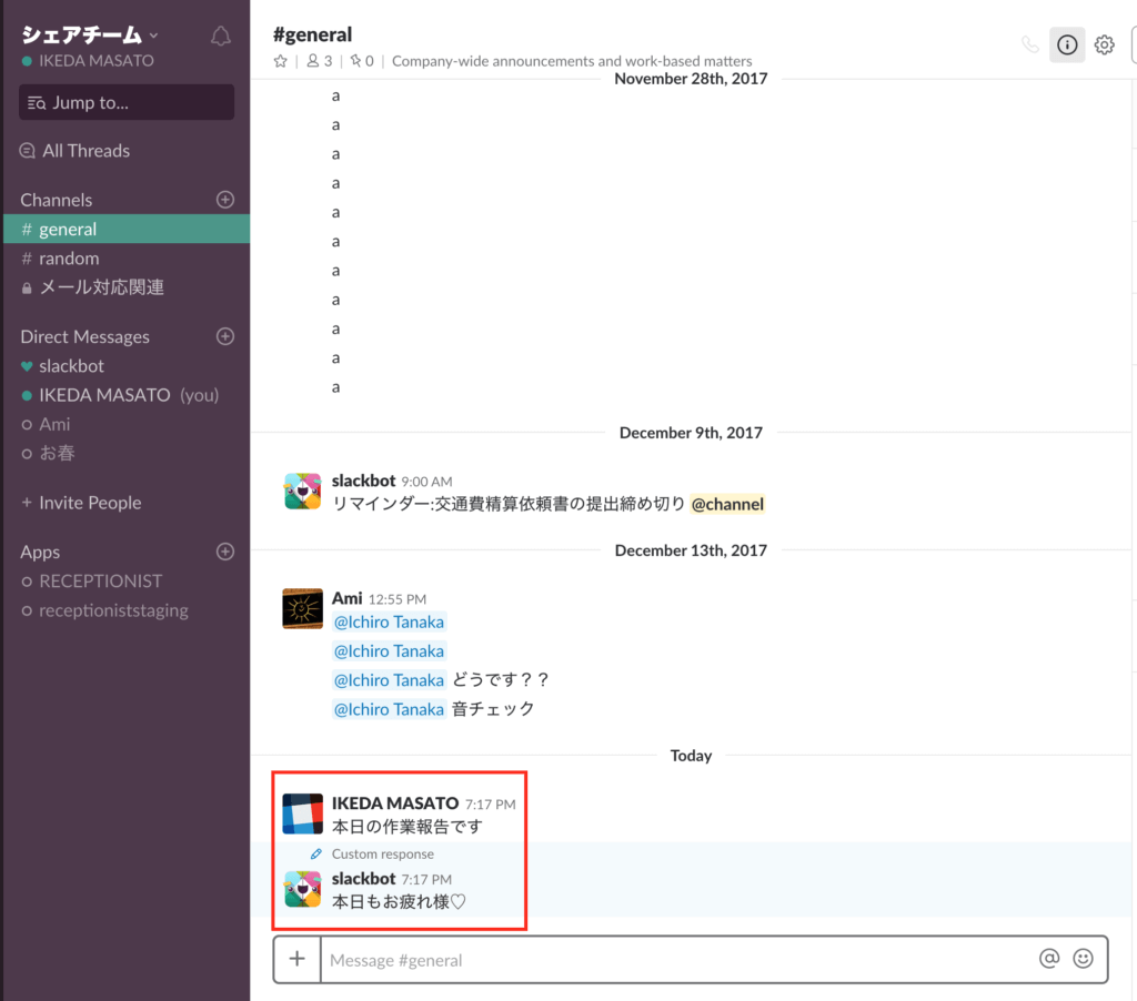 そういう時に「本日の作業報告です」とチャットした時に自動的に「本日もお疲れ様♡」みたいな返信をつけていきましょう!